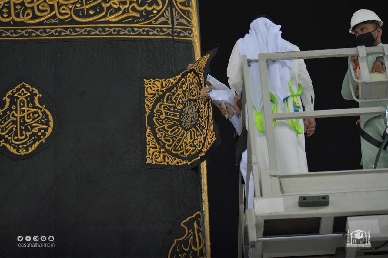 وقام فريق الإدارة العامة لمجمع الملك عبد العزيز لكسوة الكعبة المشرفة بتفكيك الكسوة القديمة وتركيب الجديدة، ثم تثبيتها في أركان الكعبة وسطحها.