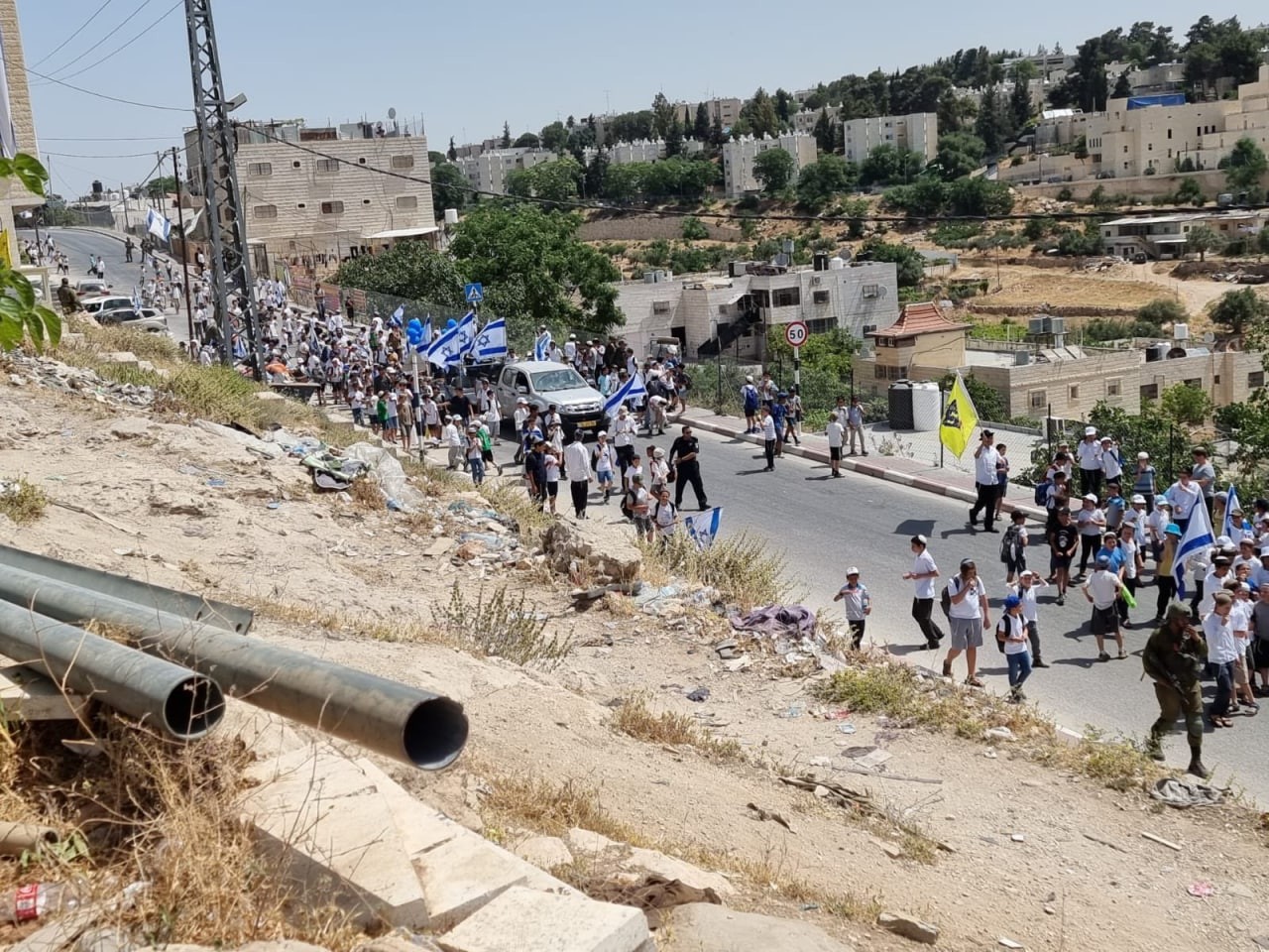 وفي سياق متصل، انطلقت مسيرة للمستوطنين من أمام مستوطنة كريات أربع في الخليل، رفعوا خلالها أعلام كيان الاحتلال، وهتفوا بشعارات عدة كالموت للعرب، وسط انتشار كثيف لجيش الاحتلال ،الذي عمل على تأمين وحماية المستوطنين.