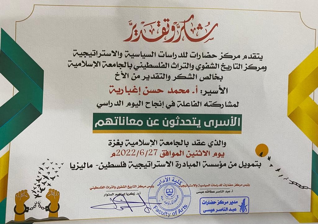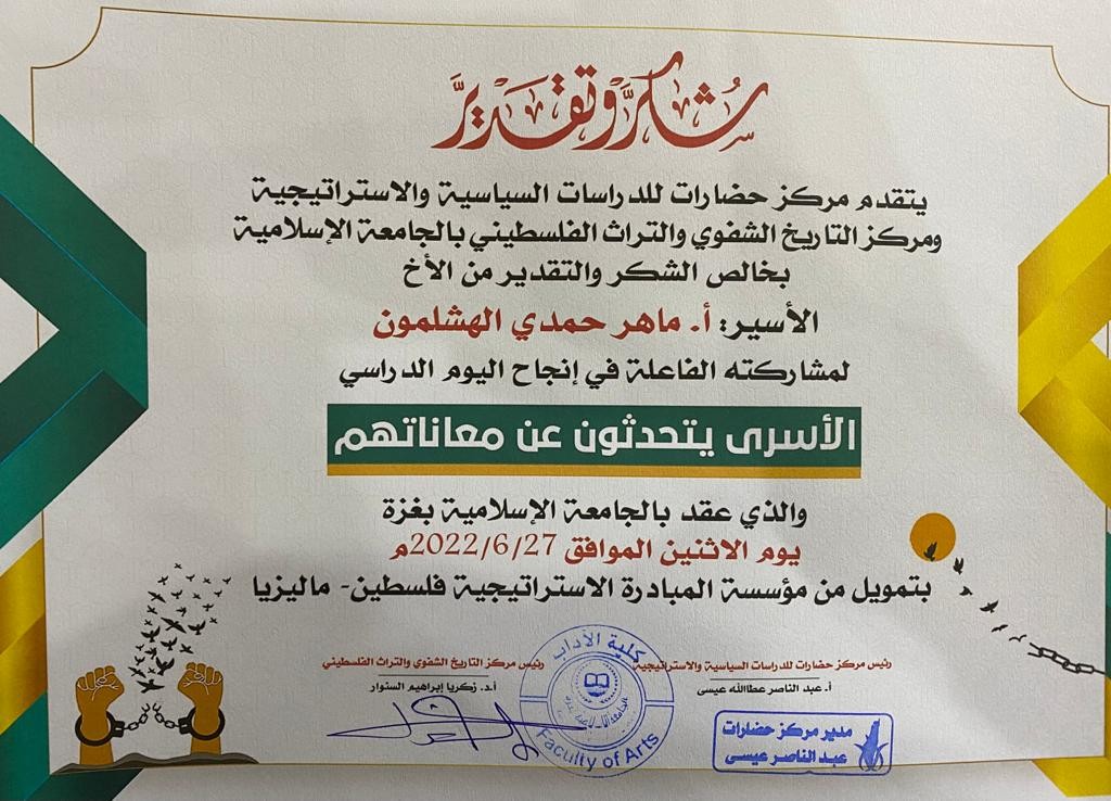 وفي نهاية اليوم الدراسي تم تكريم جميع الأسرى الذين سجلوا شهادتهم في اليوم الدراسي وهم تسعة عشر أسيرًا من الضفة والقدس والداخل المحتل وقطاع غزة، وتسلم الأستاذ تامر الزعانين الناطق الإعلامي لمؤسسة مهجة القدس للشهداء والأسرى والجرحى بالنيابة عن أسرى الجهاد شهادات شكر وتقدير من منظمي اليوم الدراسي.