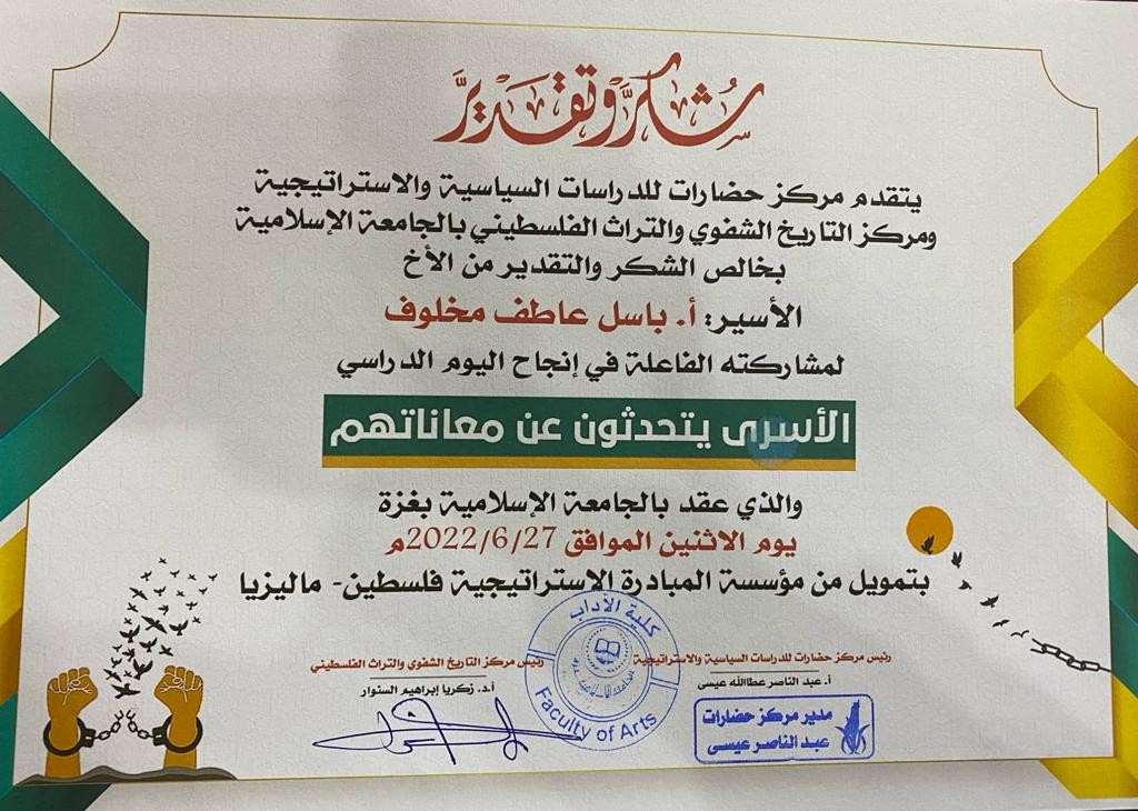 وتقدم الأسير المجاهد باسل عاطف مخلوف بشهادة مكتوبة وصلت مركز التاريخ الشفوي والتراث الفلسطيني بالجامعة الإسلامية بعنوان: "تأثير صفقات التبادل على الأمل في الحرية في نفوس الأسرى"، استعرض من خلالها المشاعر التي عاشها خلال صفقة تبادل الأسرى التى تمت بين حزب الله والاحتلال الصهيوني والأمل الذي بعث في نفسه بعد تصريح السيد حسن نصر الله حينها بأن الفرحة ستدخل كل بيت فلسطيني، ولكن قدر الله غالب ولم يشأ الله له أن يتحرر في تلك الصفقة.