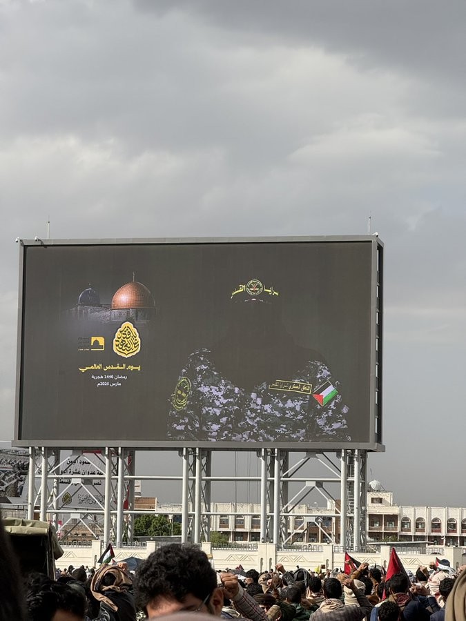 وبحسب الكلمة التي عرضت للناطق باسم "سرايا القدس" أمام حشود في العاصمة اليمنية صنعاء، فإن "هذا الإدراك سينعكس آجلا أم عاجلا على بقاء الصهاينة على أرض فلسطين".