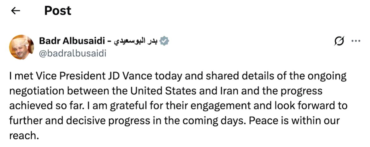 أكد وزير الخارجية العُماني بدر البوسعيدي، أنه عقد لقاءً مع نائب الرئيس الأميركي جيه دي فانس، جرى خلاله استعراض تفاصيل المفاوضات الجارية بين الولايات المتحدة وإيران، إضافة إلى تقييم مستوى التقدم المُحرز حتى الآن.
